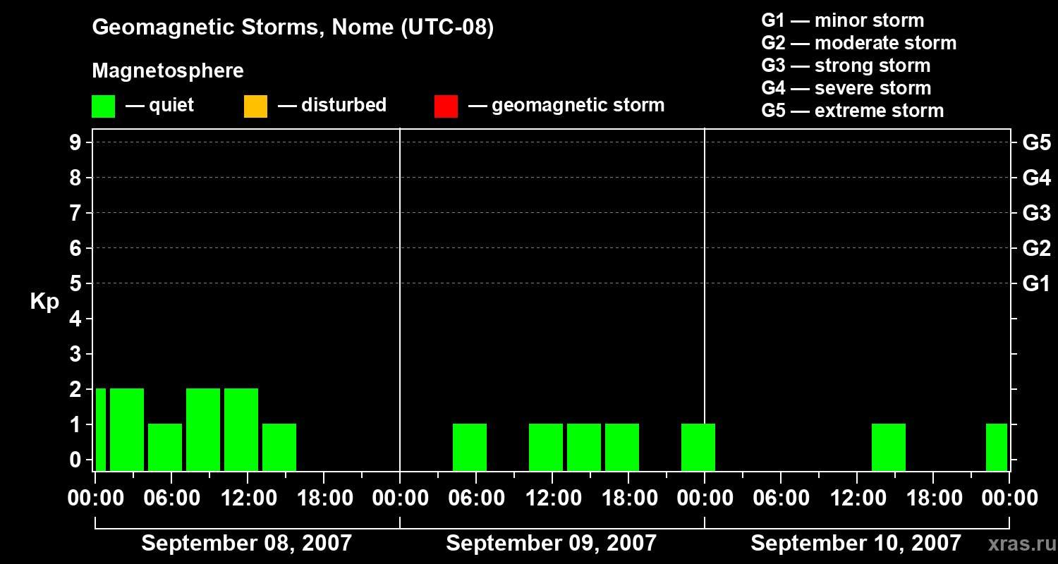 Changes in the geomagnetic index Kp from September 8 to 10, 2007 for mid latitudes