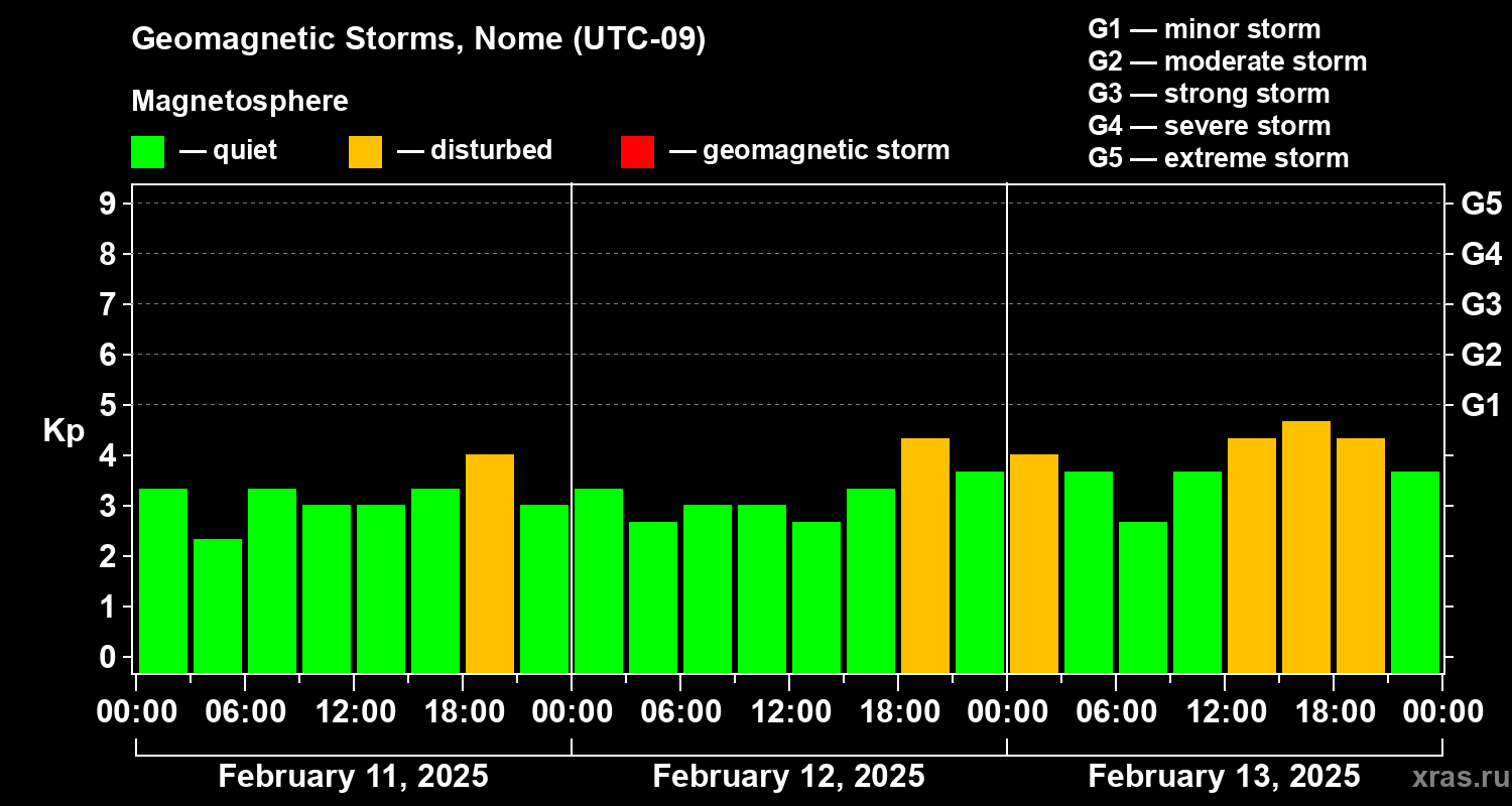 Changes in the geomagnetic index Kp from February 11 to 13, 2025 for mid latitudes