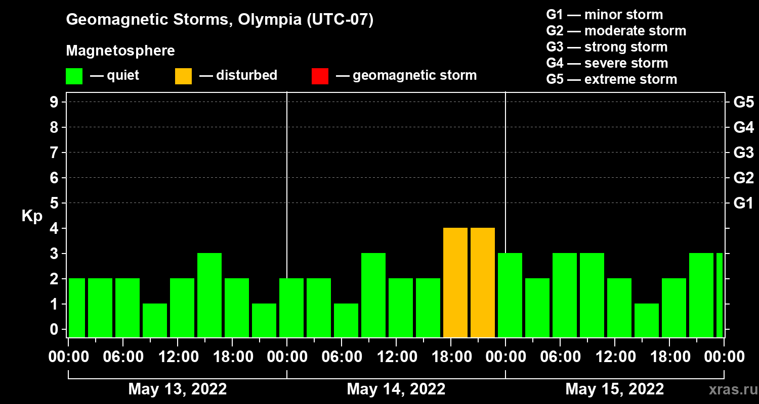Changes in the geomagnetic index Kp from May 13 to 15, 2022 for mid latitudes