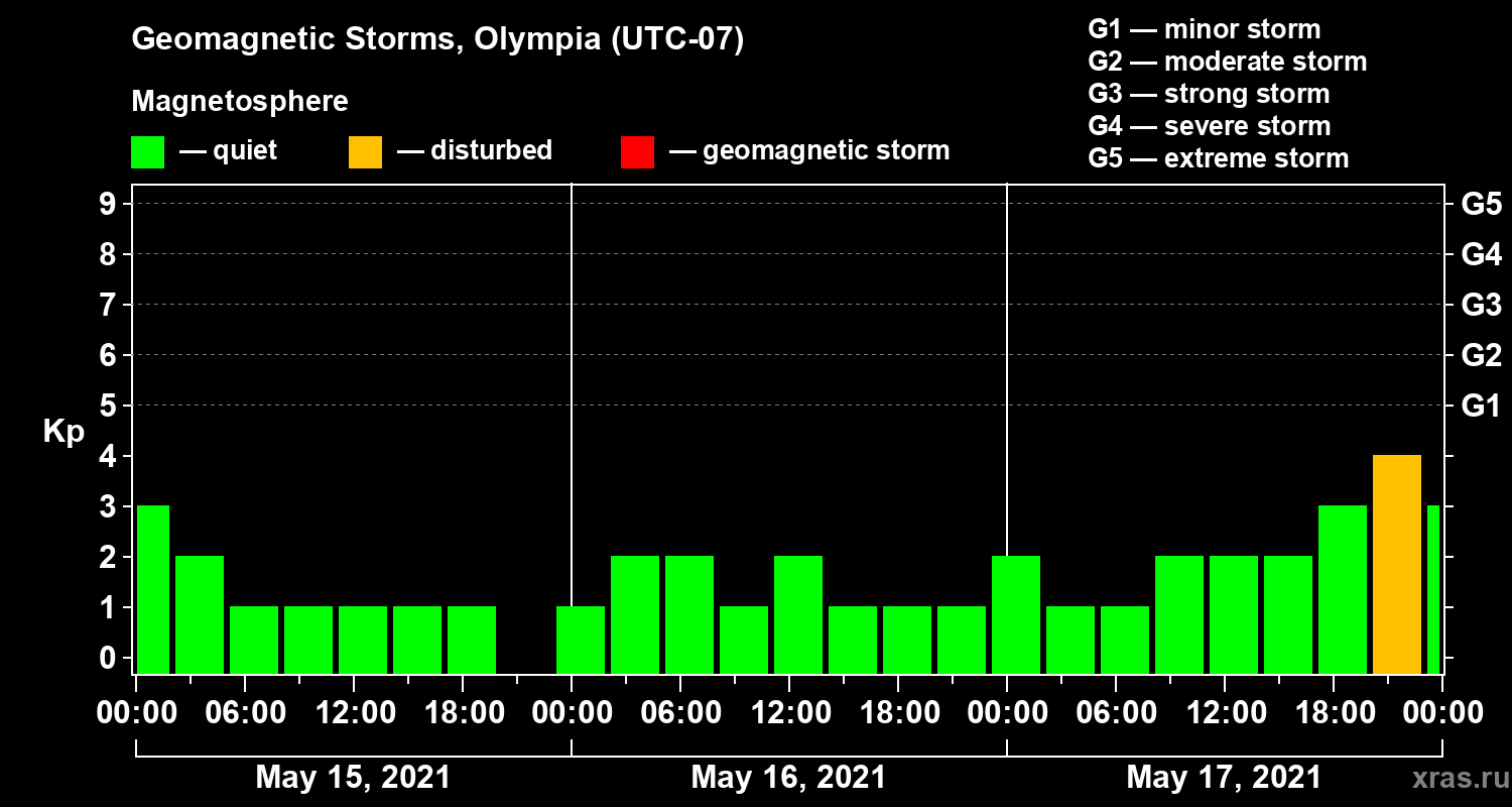 Changes in the geomagnetic index Kp from May 15 to 17, 2021 for mid latitudes