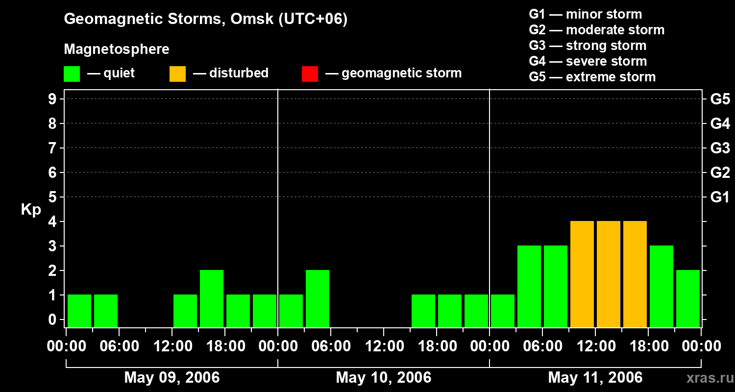 Changes in the geomagnetic index Kp from May 9 to 11, 2006 for mid latitudes