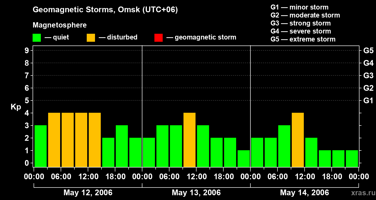 Changes in the geomagnetic index Kp from May 12 to 14, 2006 for mid latitudes