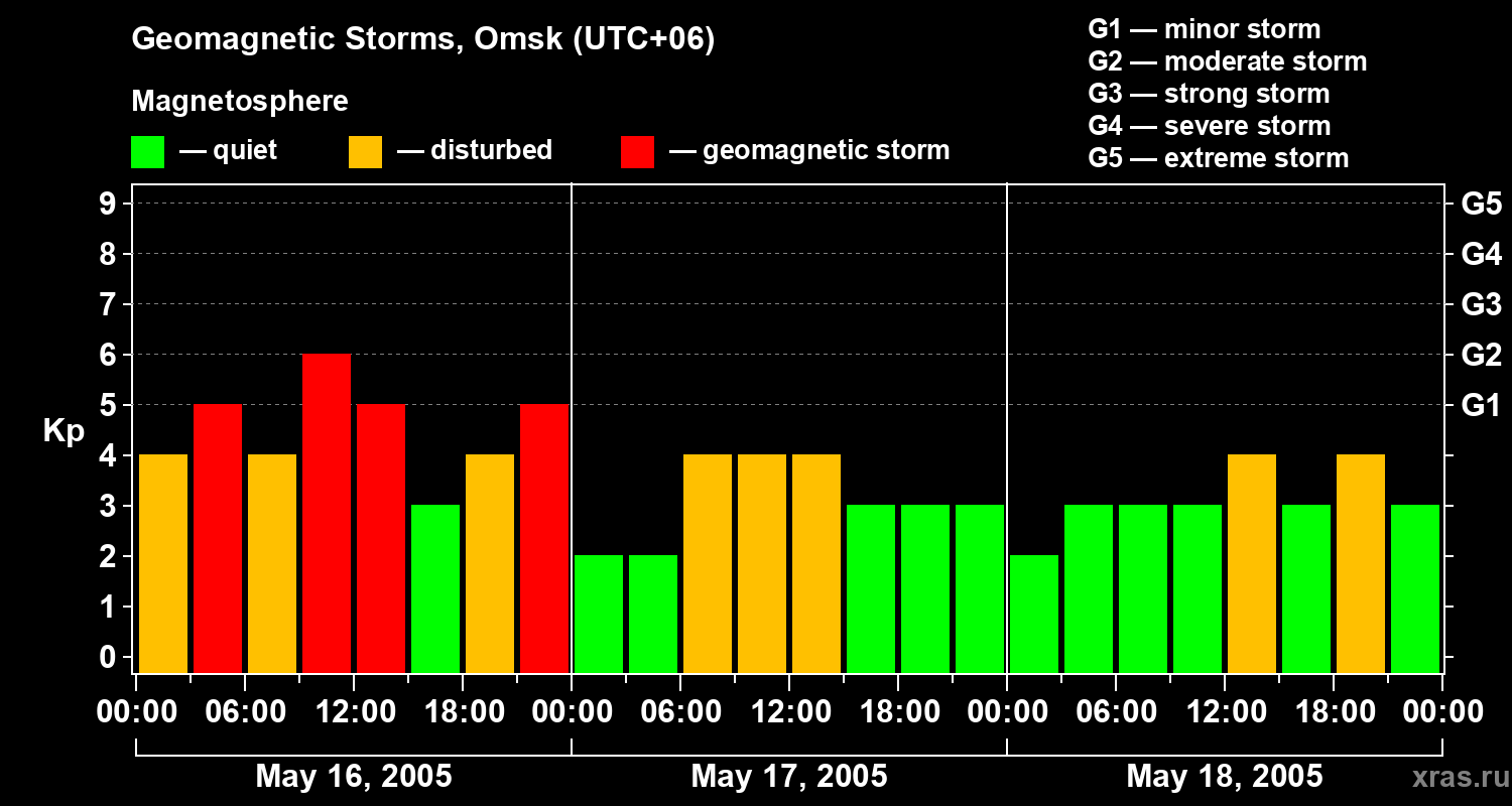 Changes in the geomagnetic index Kp from May 16 to 18, 2005 for mid latitudes