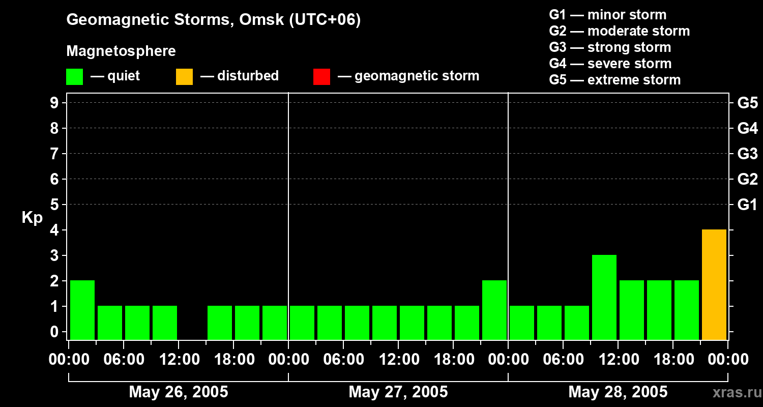 Changes in the geomagnetic index Kp from May 26 to 28, 2005 for mid latitudes
