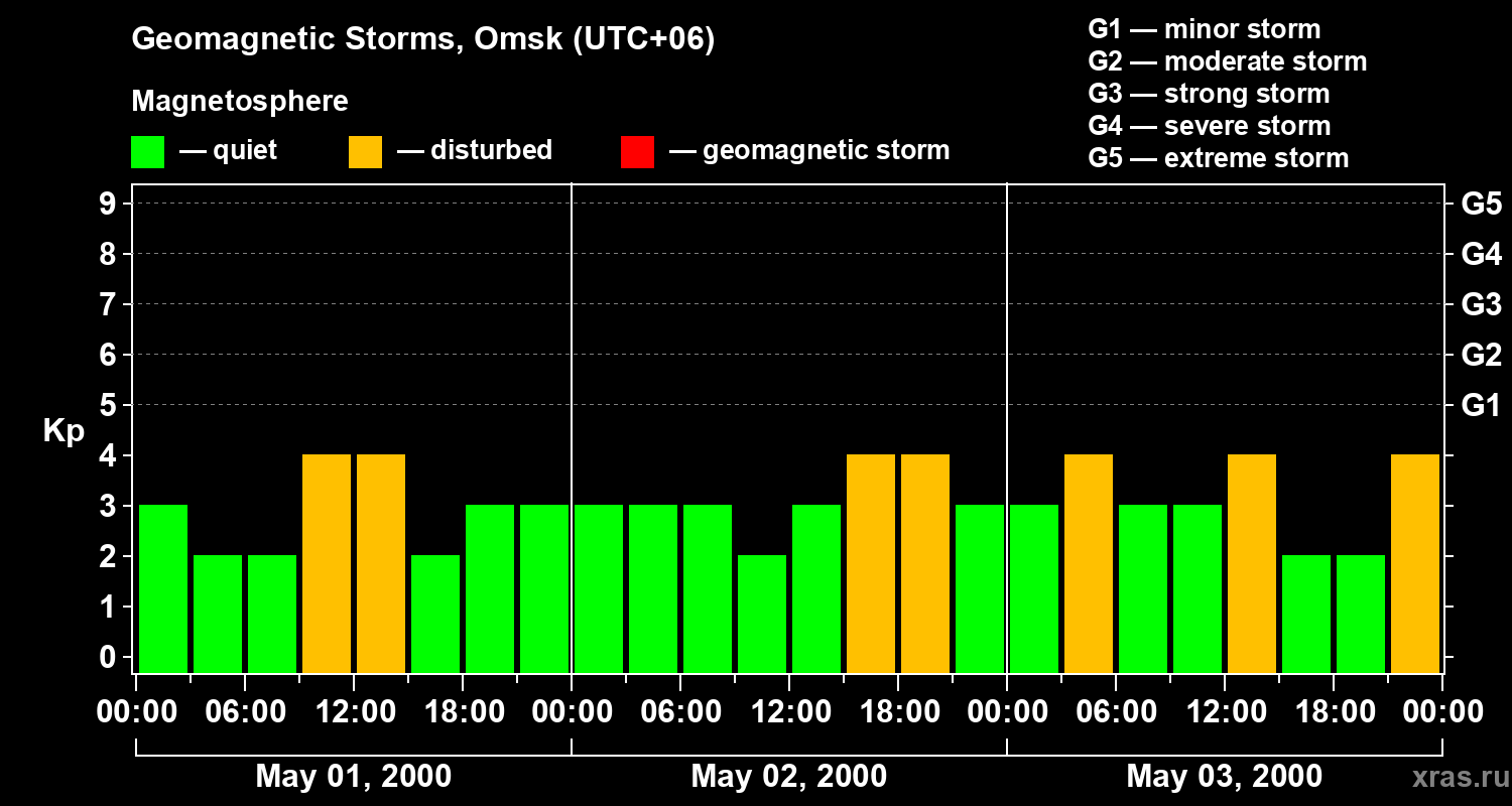 Changes in the geomagnetic index Kp from May 1 to 3, 2000 for mid latitudes