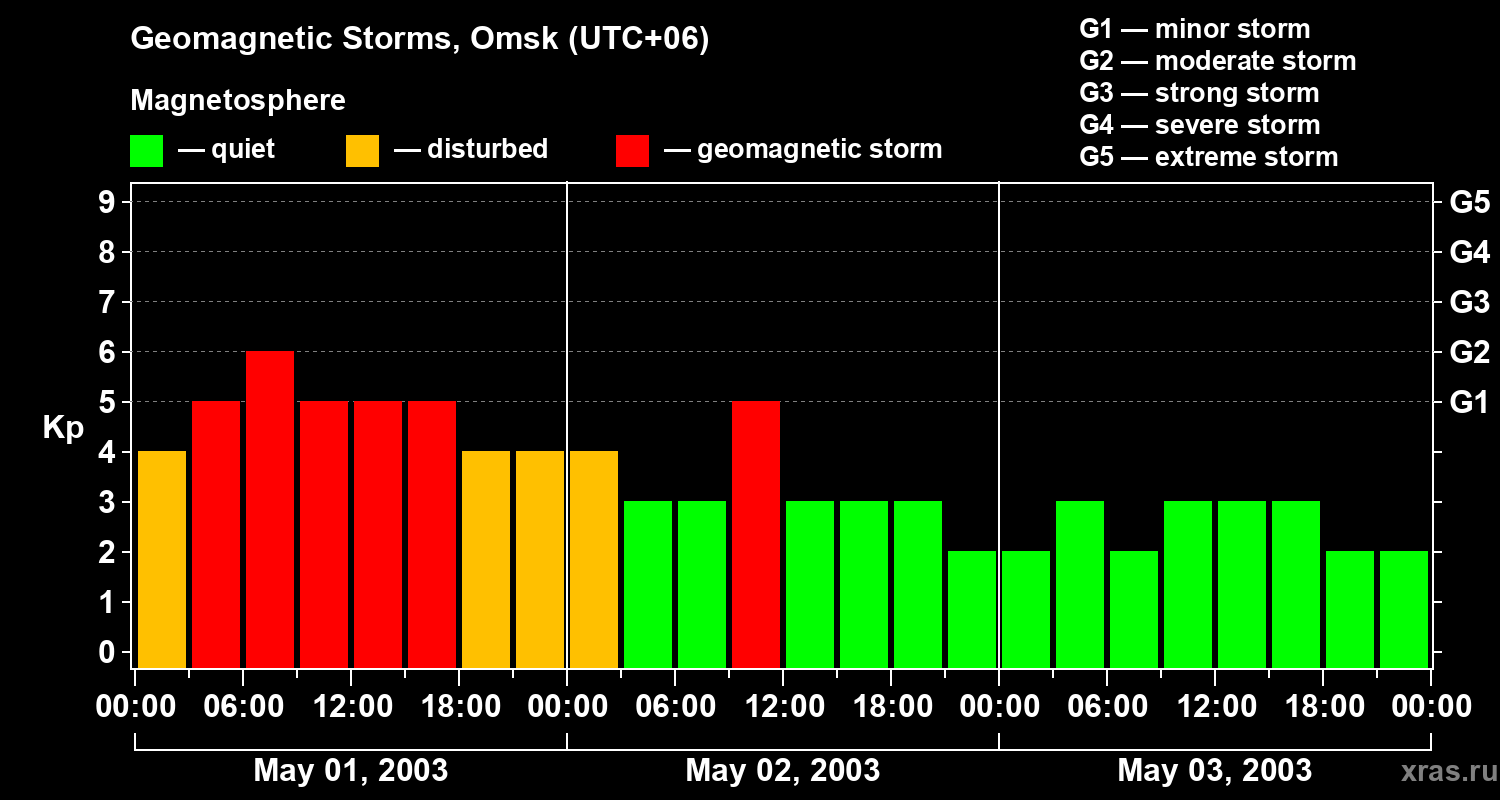 Changes in the geomagnetic index Kp from May 1 to 3, 2003 for mid latitudes