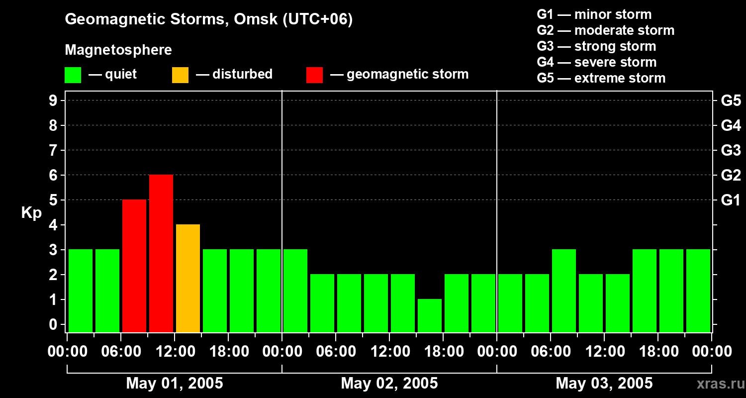 Changes in the geomagnetic index Kp from May 1 to 3, 2005 for mid latitudes