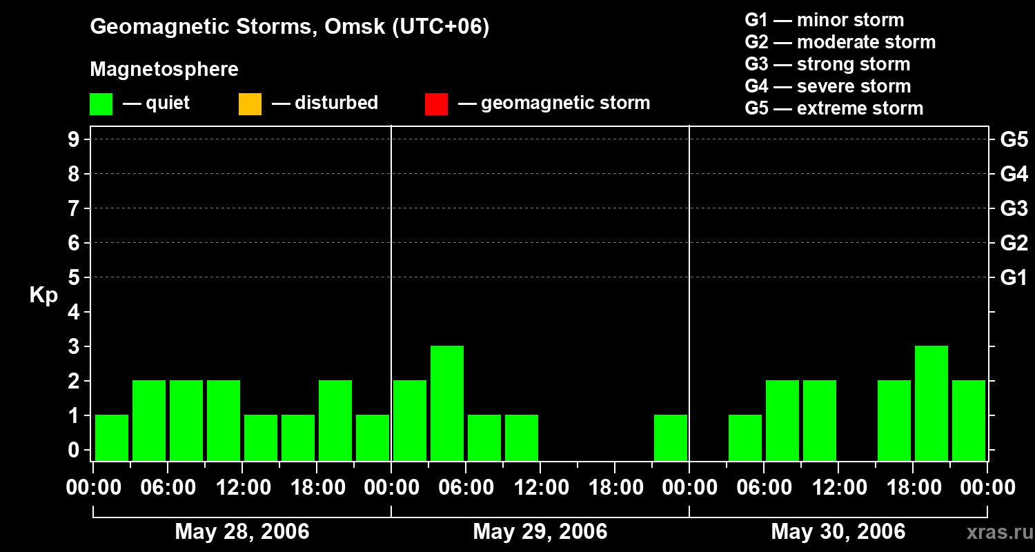 Changes in the geomagnetic index Kp from May 28 to 30, 2006 for mid latitudes
