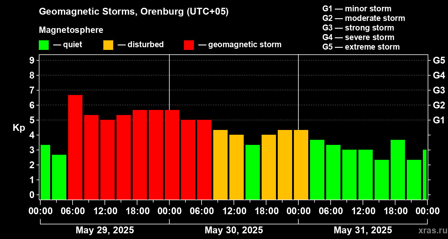 Changes in the geomagnetic index Kp from May 29 to 31, 2025 for mid latitudes