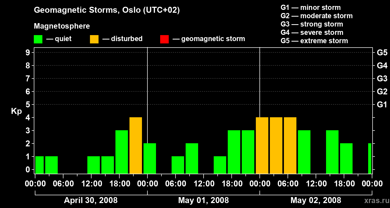Changes in the geomagnetic index Kp from April 30 to May 2, 2008 for mid latitudes