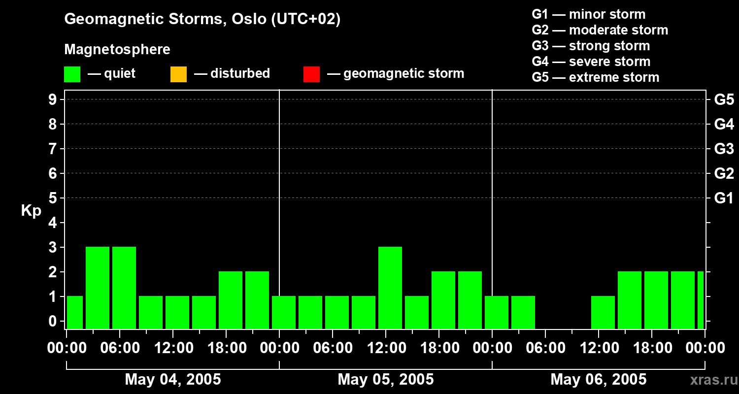 Changes in the geomagnetic index Kp from May 4 to 6, 2005 for mid latitudes