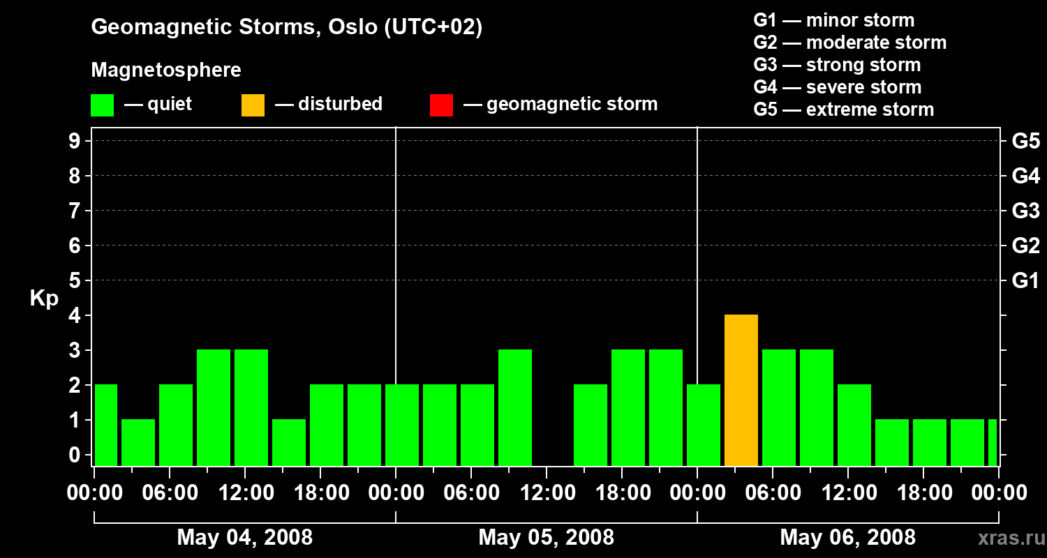 Changes in the geomagnetic index Kp from May 4 to 6, 2008 for mid latitudes