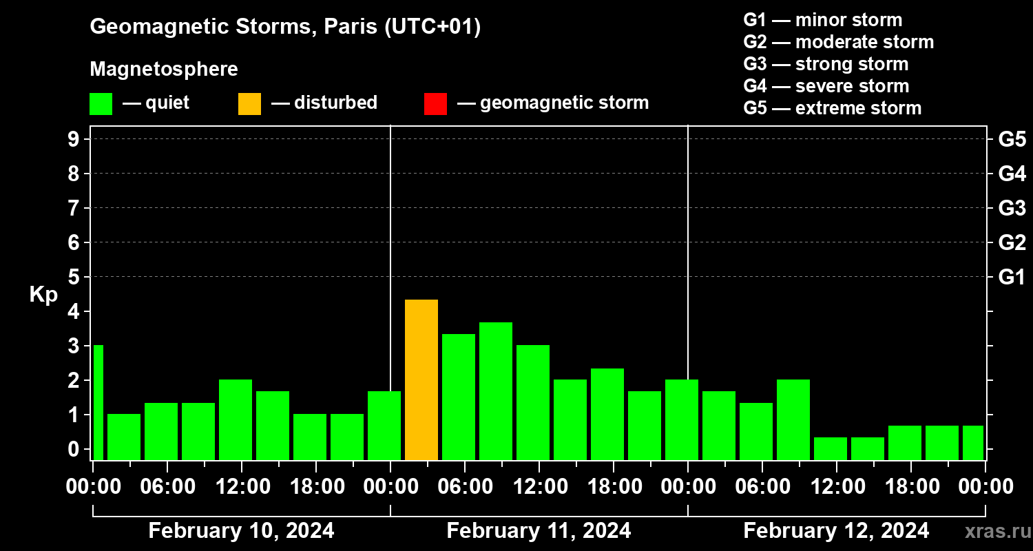 Changes in the geomagnetic index Kp from February 10 to 12, 2024 for mid latitudes