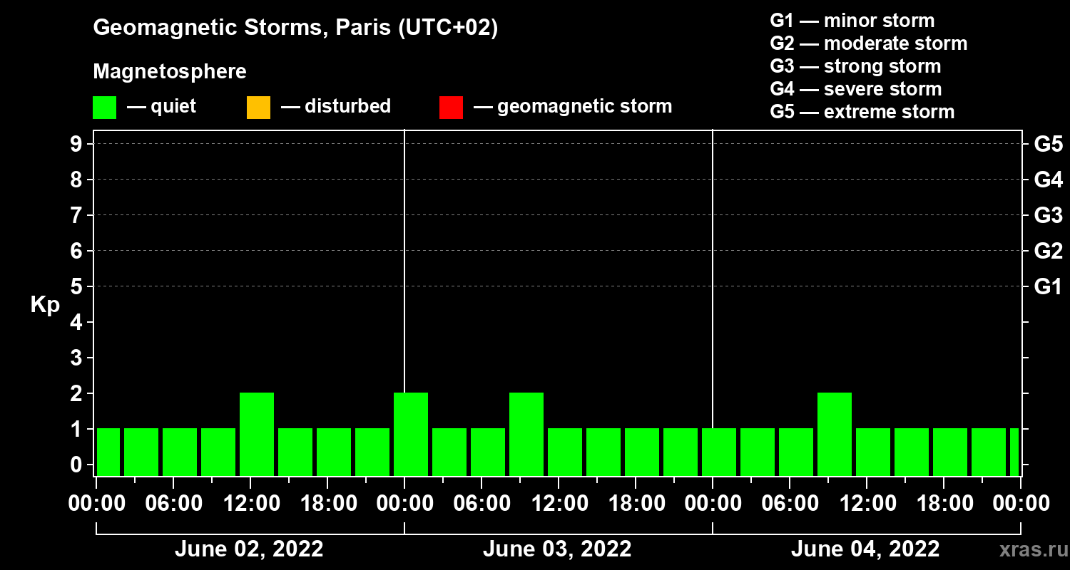 Changes in the geomagnetic index Kp from June 2 to 4, 2022 for mid latitudes