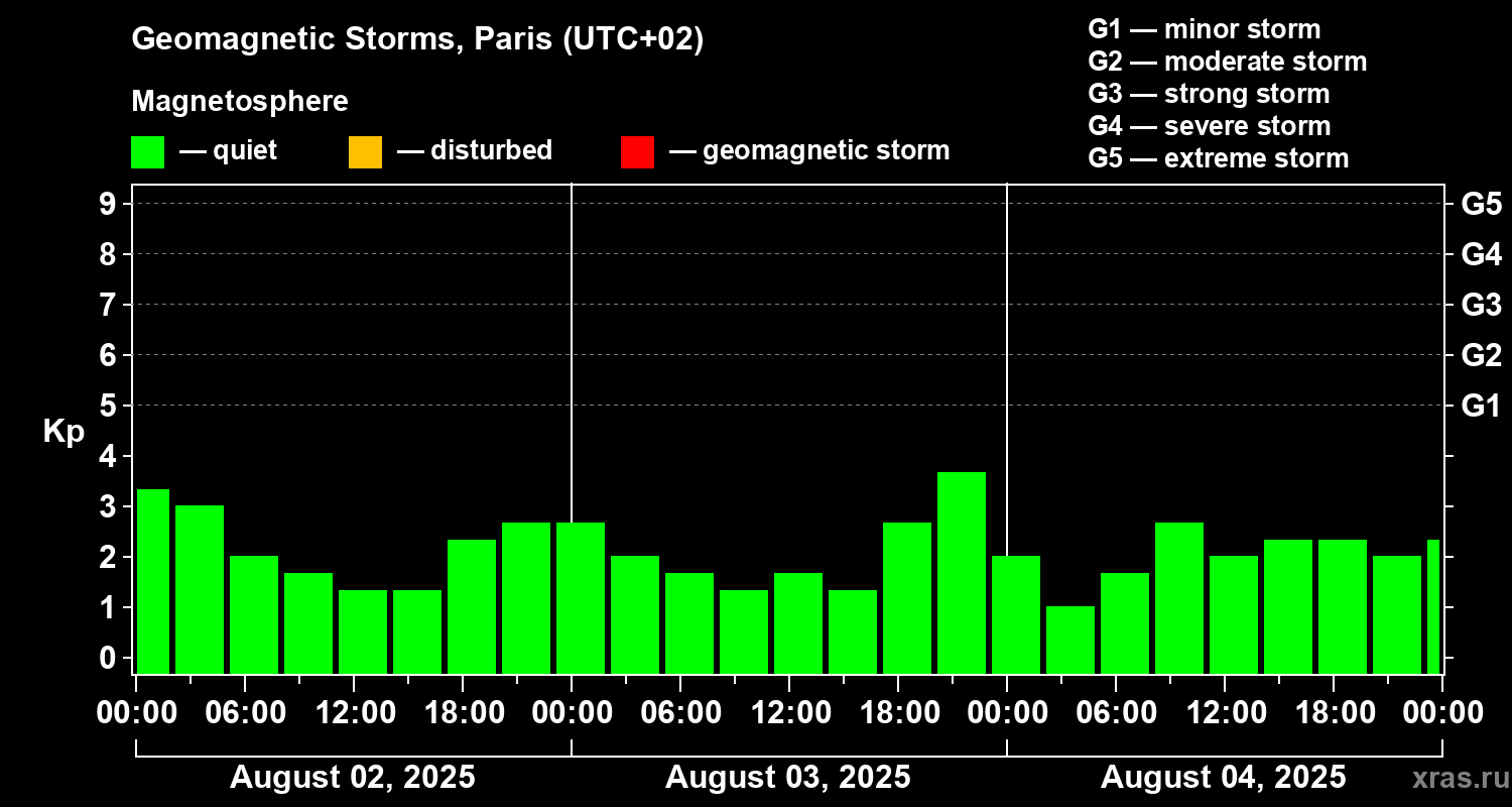 Changes in the geomagnetic index Kp from August 2 to 4, 2025 for mid latitudes