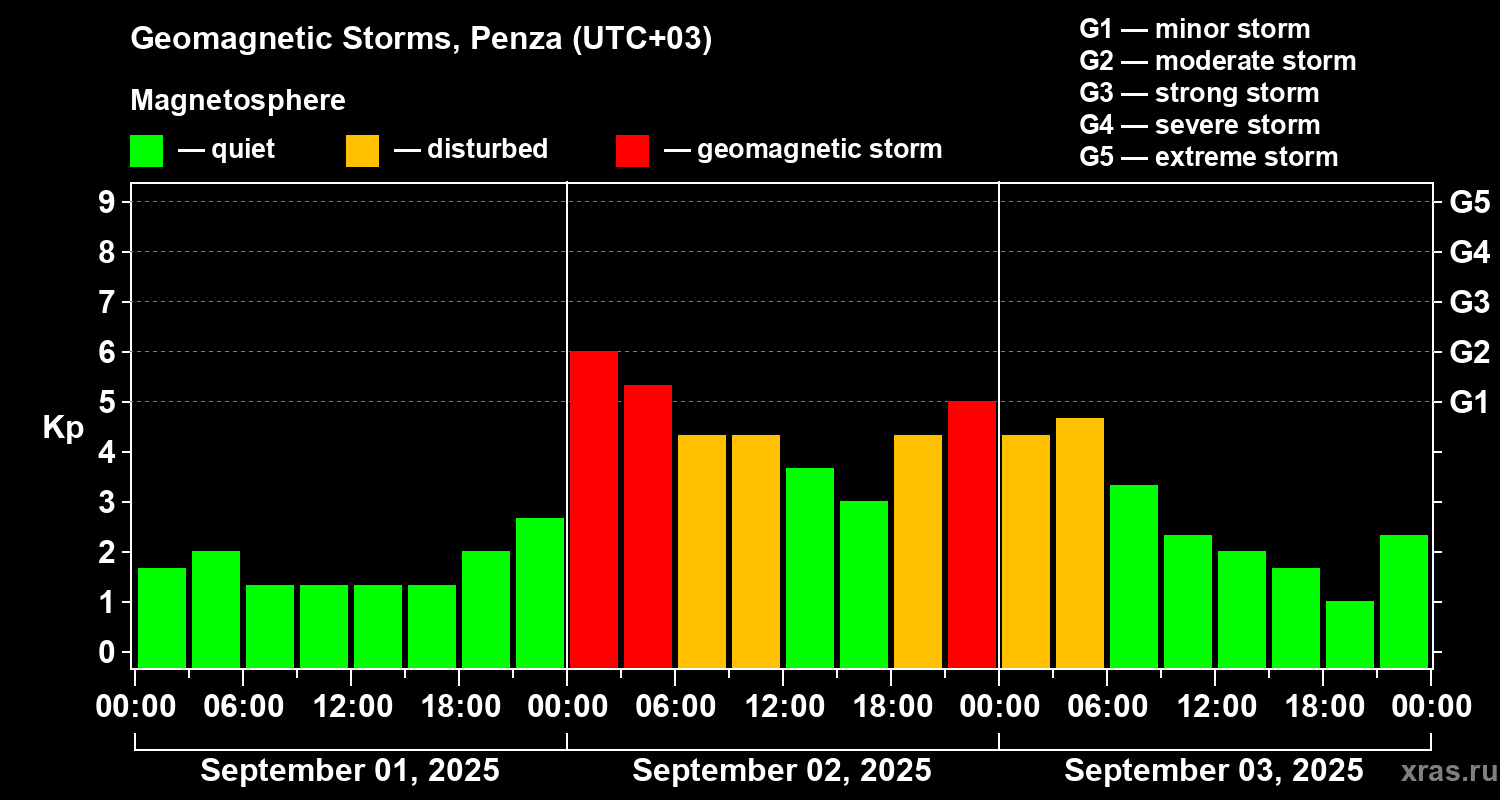 Changes in the geomagnetic index Kp from September 1 to 3, 2025 for mid latitudes