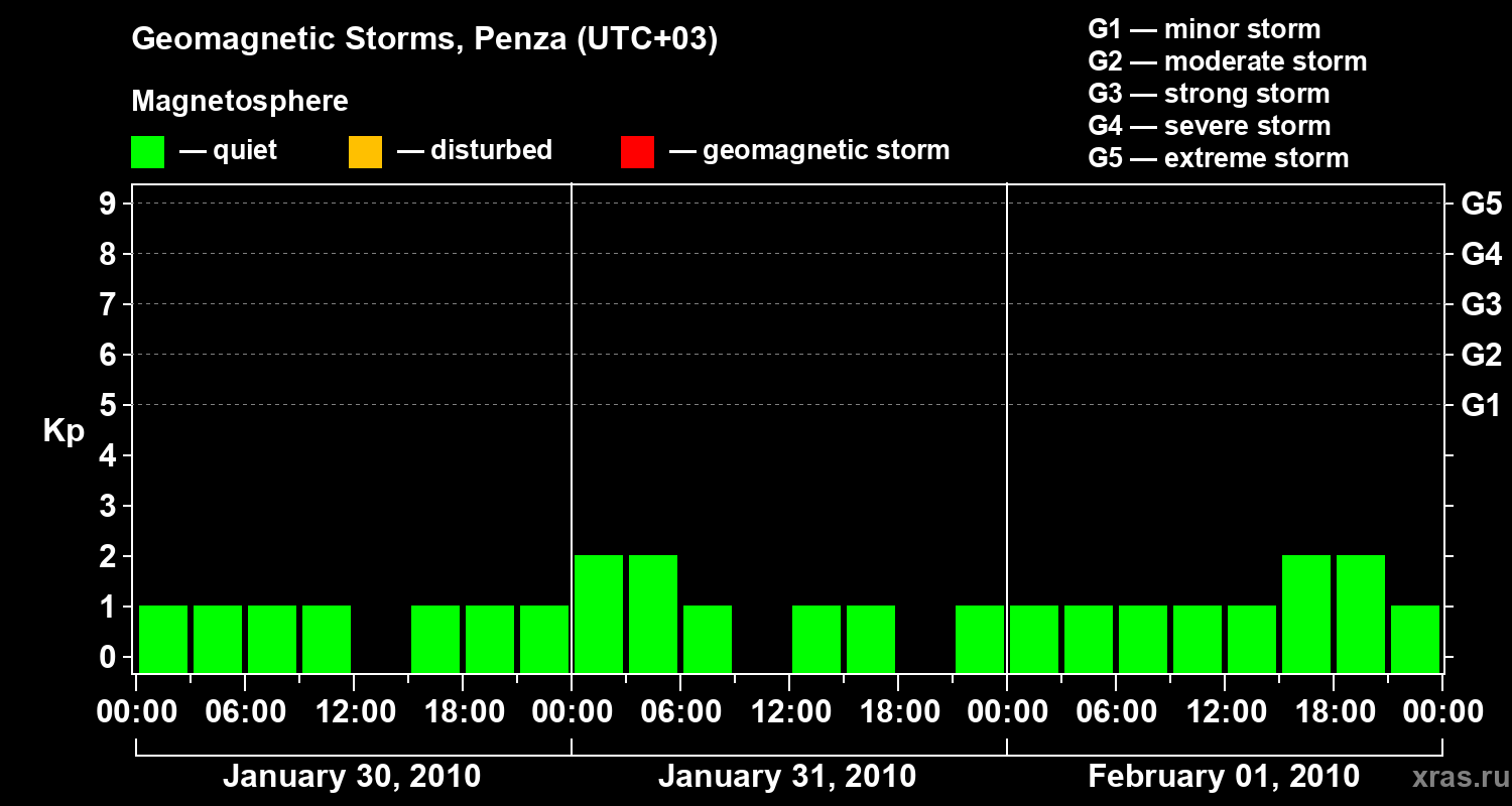 Changes in the geomagnetic index Kp from January 30 to February 1, 2010 for mid latitudes