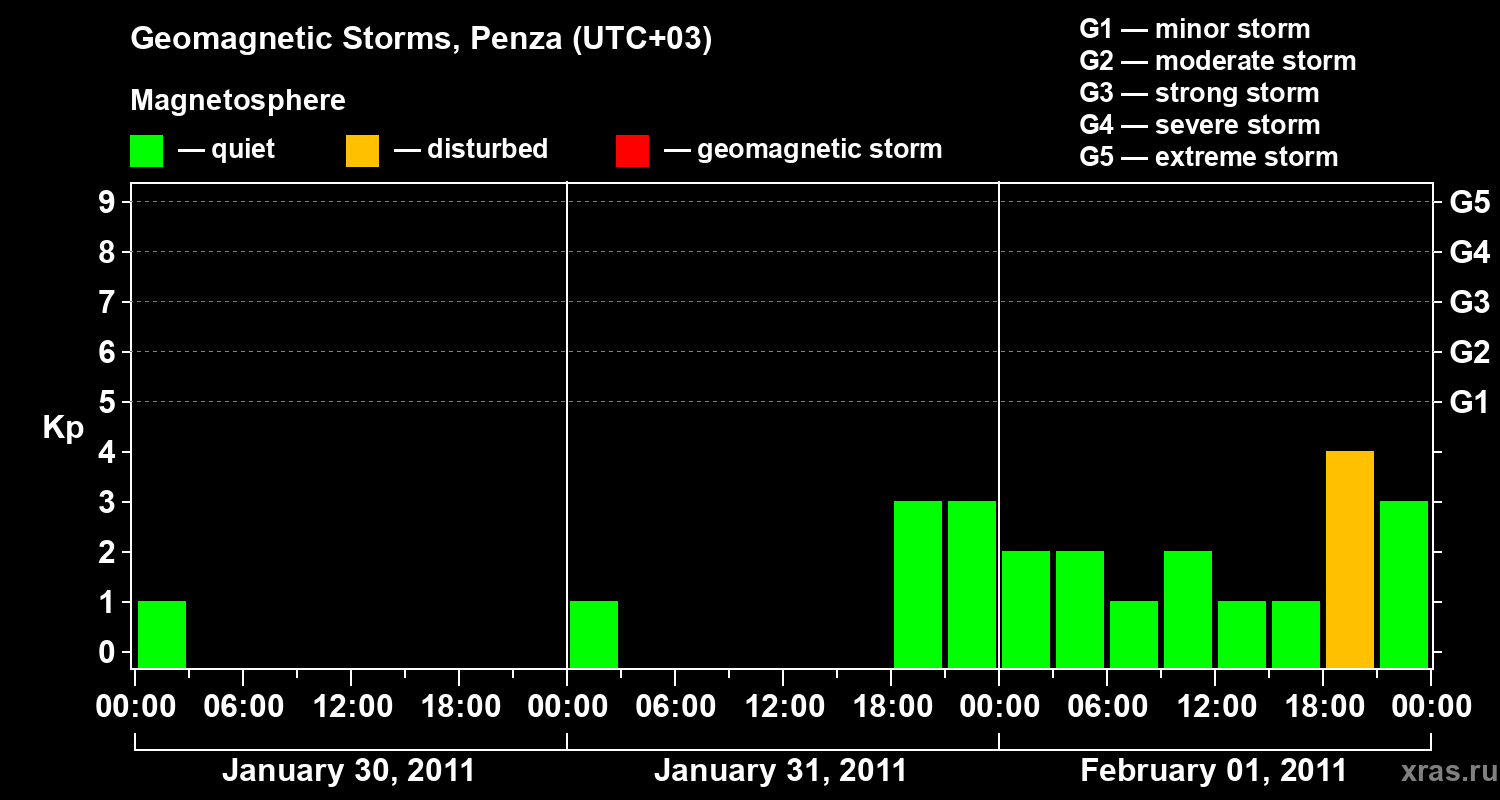 Changes in the geomagnetic index Kp from January 30 to February 1, 2011 for mid latitudes