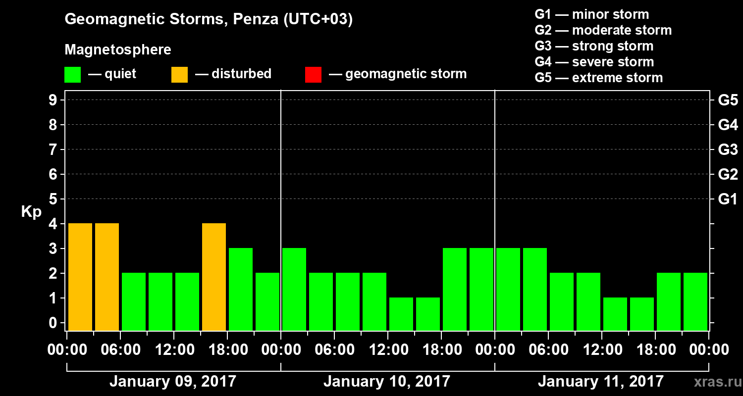 Changes in the geomagnetic index Kp from January 9 to 11, 2017 for mid latitudes