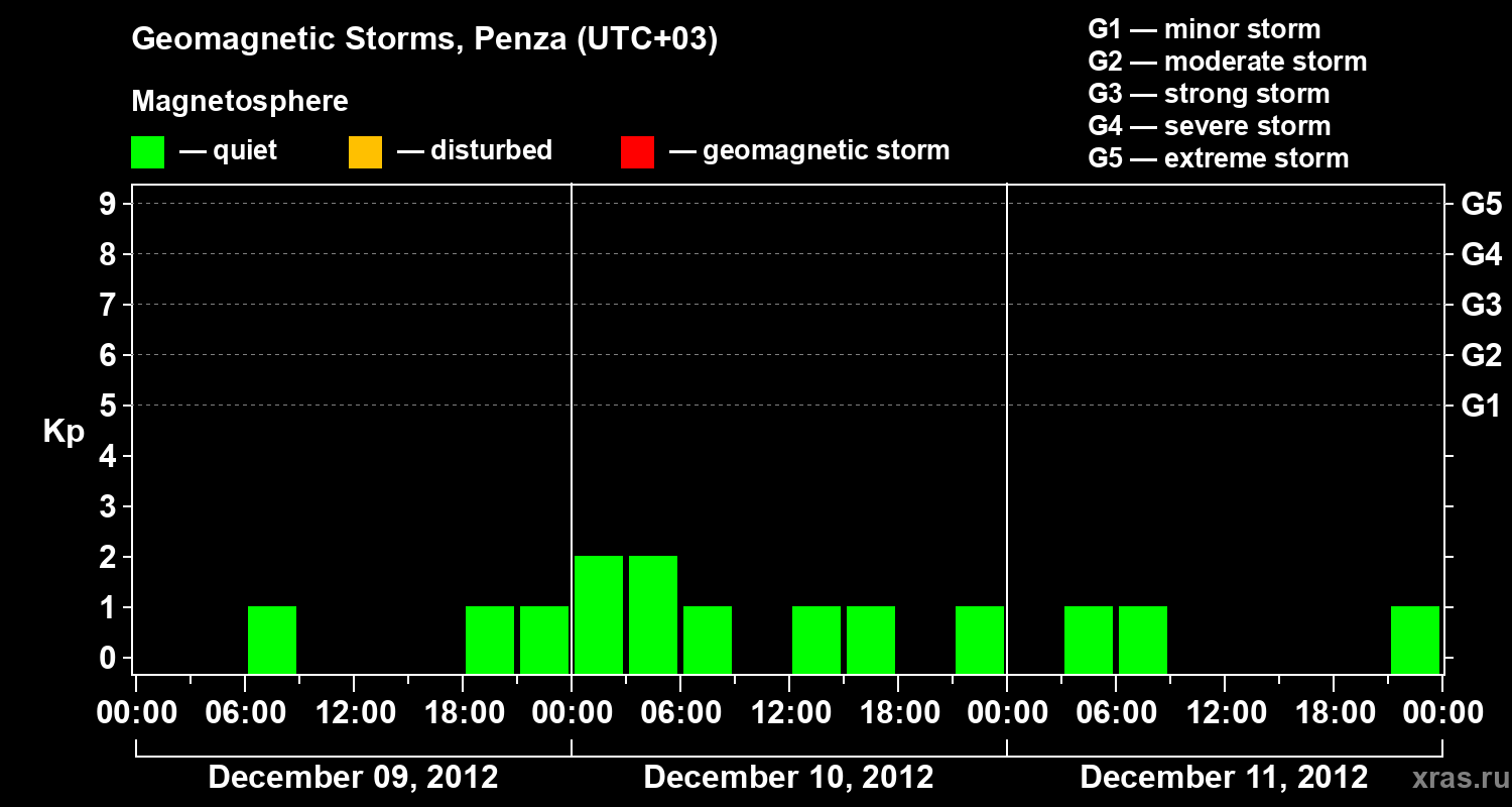 Changes in the geomagnetic index Kp from December 9 to 11, 2012 for mid latitudes