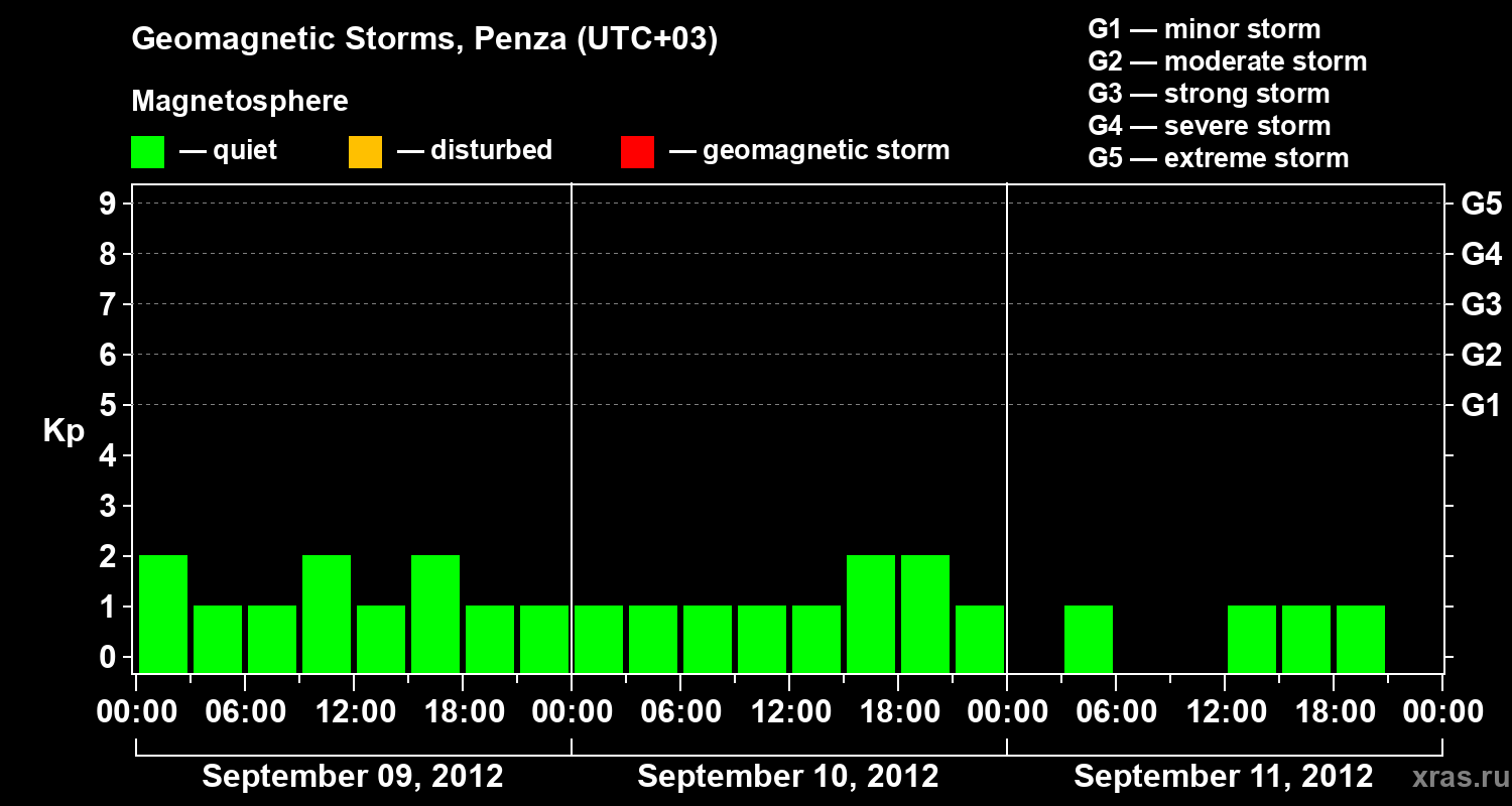 Changes in the geomagnetic index Kp from September 9 to 11, 2012 for mid latitudes