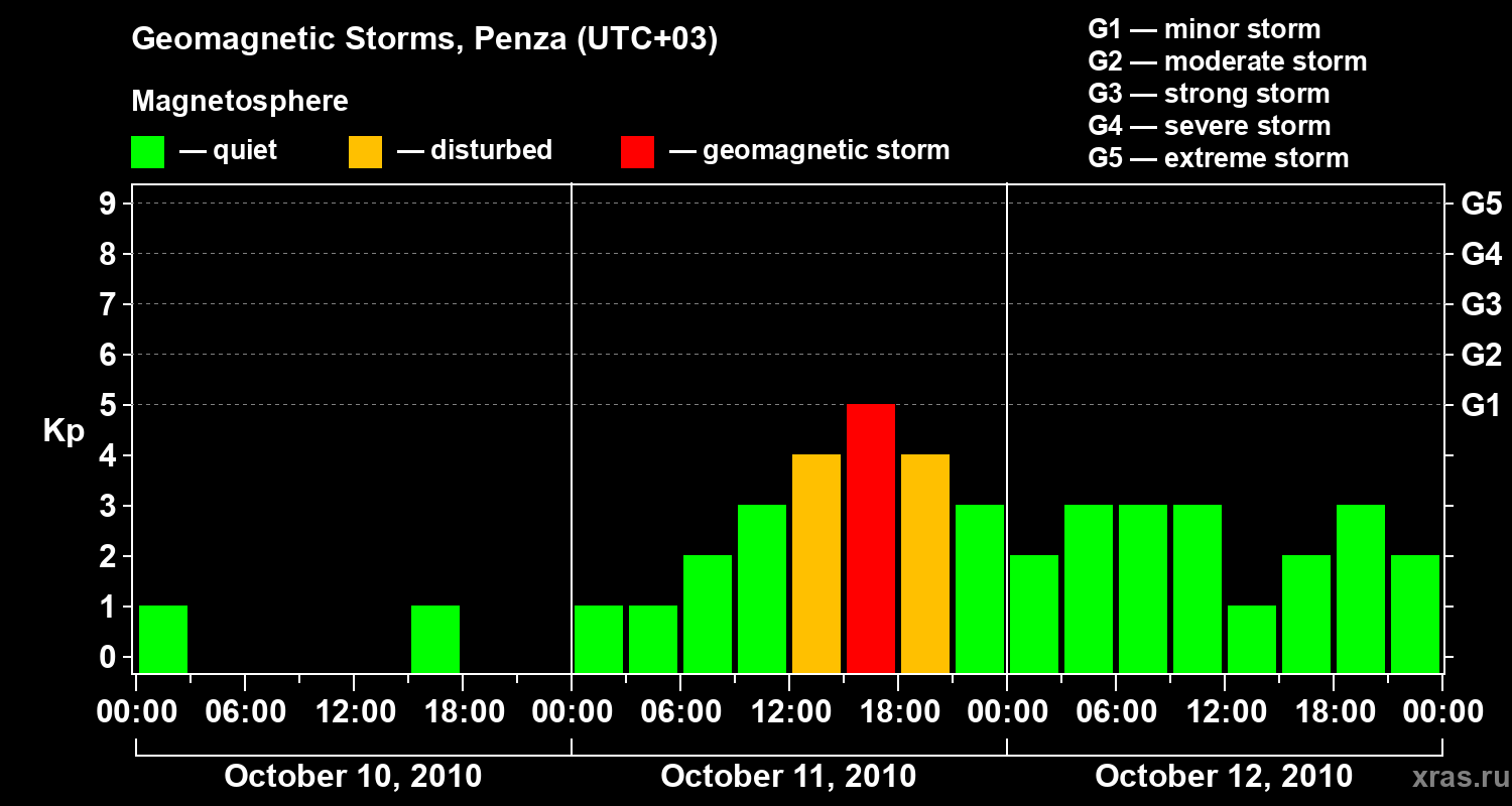 Changes in the geomagnetic index Kp from October 10 to 12, 2010 for mid latitudes
