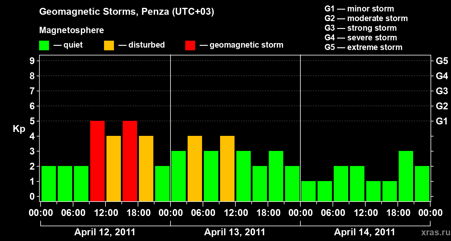 Changes in the geomagnetic index Kp from April 12 to 14, 2011 for mid latitudes