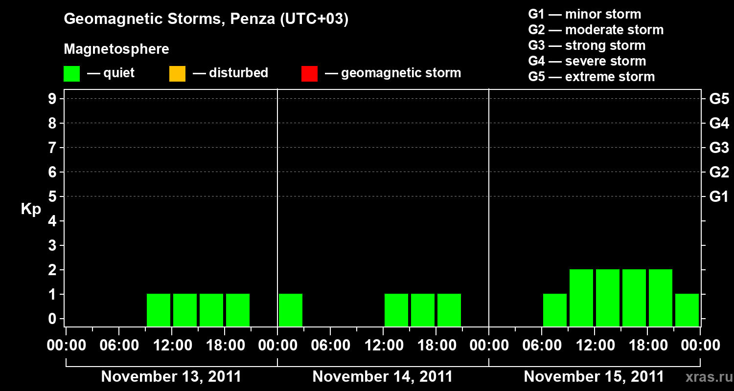 Changes in the geomagnetic index Kp from November 13 to 15, 2011 for mid latitudes