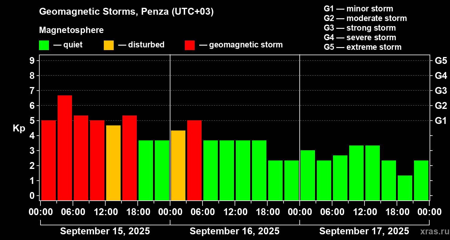 Changes in the geomagnetic index Kp from September 15 to 17, 2025 for mid latitudes