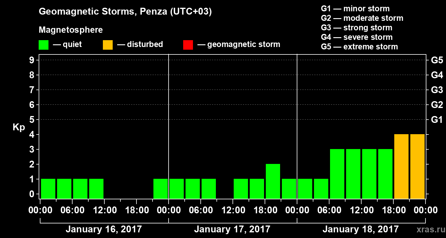 Changes in the geomagnetic index Kp from January 16 to 18, 2017 for mid latitudes