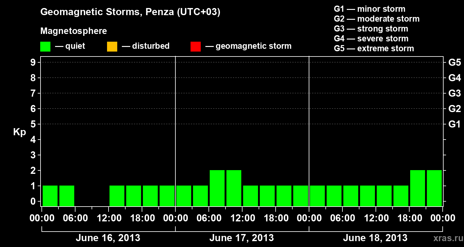 Changes in the geomagnetic index Kp from June 16 to 18, 2013 for mid latitudes