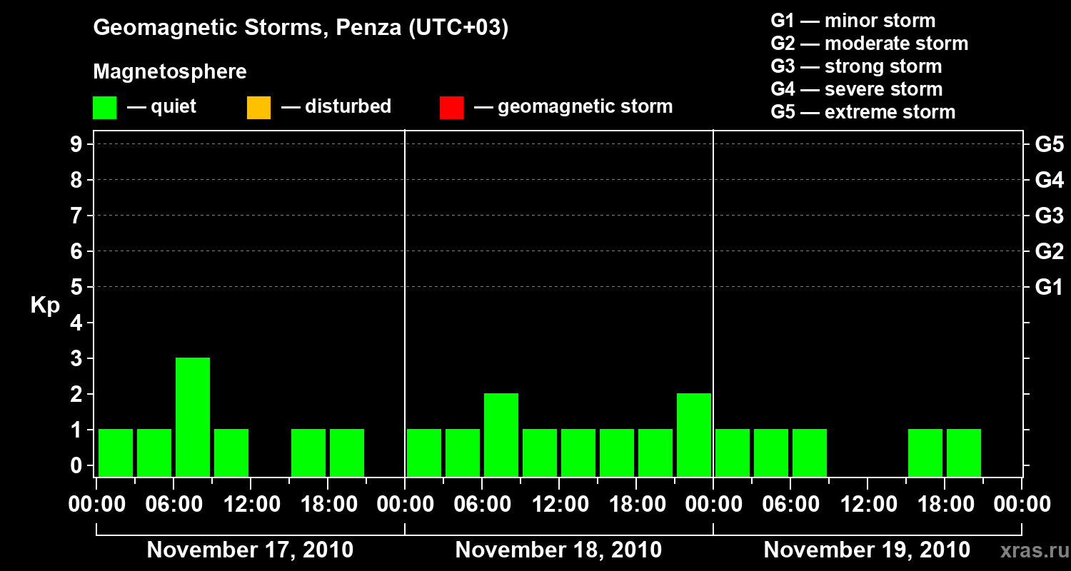 Changes in the geomagnetic index Kp from November 17 to 19, 2010 for mid latitudes