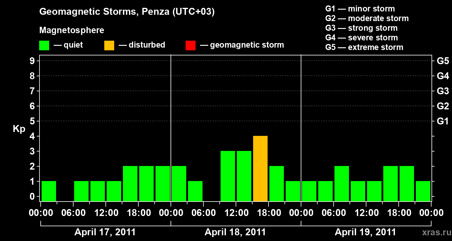 Changes in the geomagnetic index Kp from April 17 to 19, 2011 for mid latitudes
