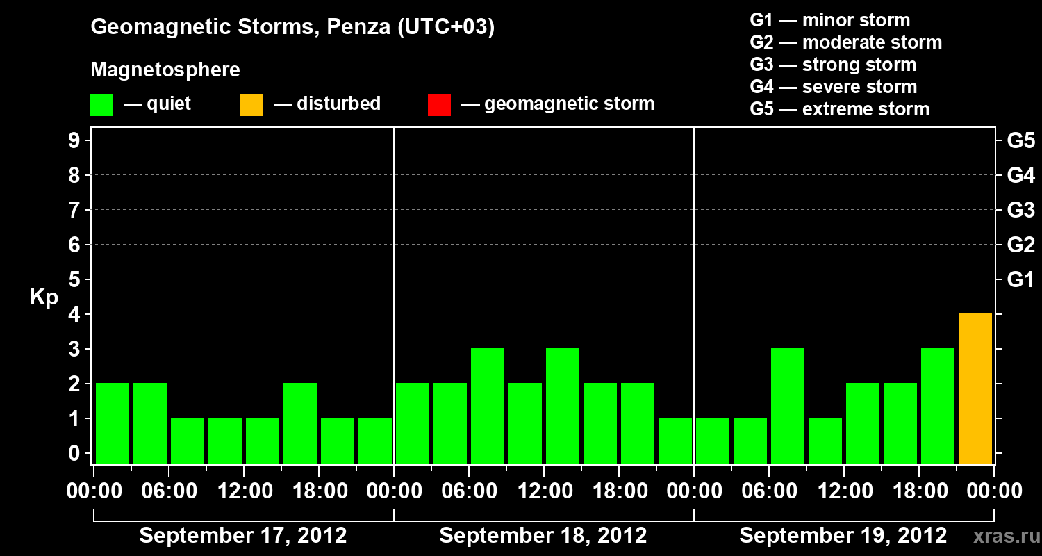 Changes in the geomagnetic index Kp from September 17 to 19, 2012 for mid latitudes