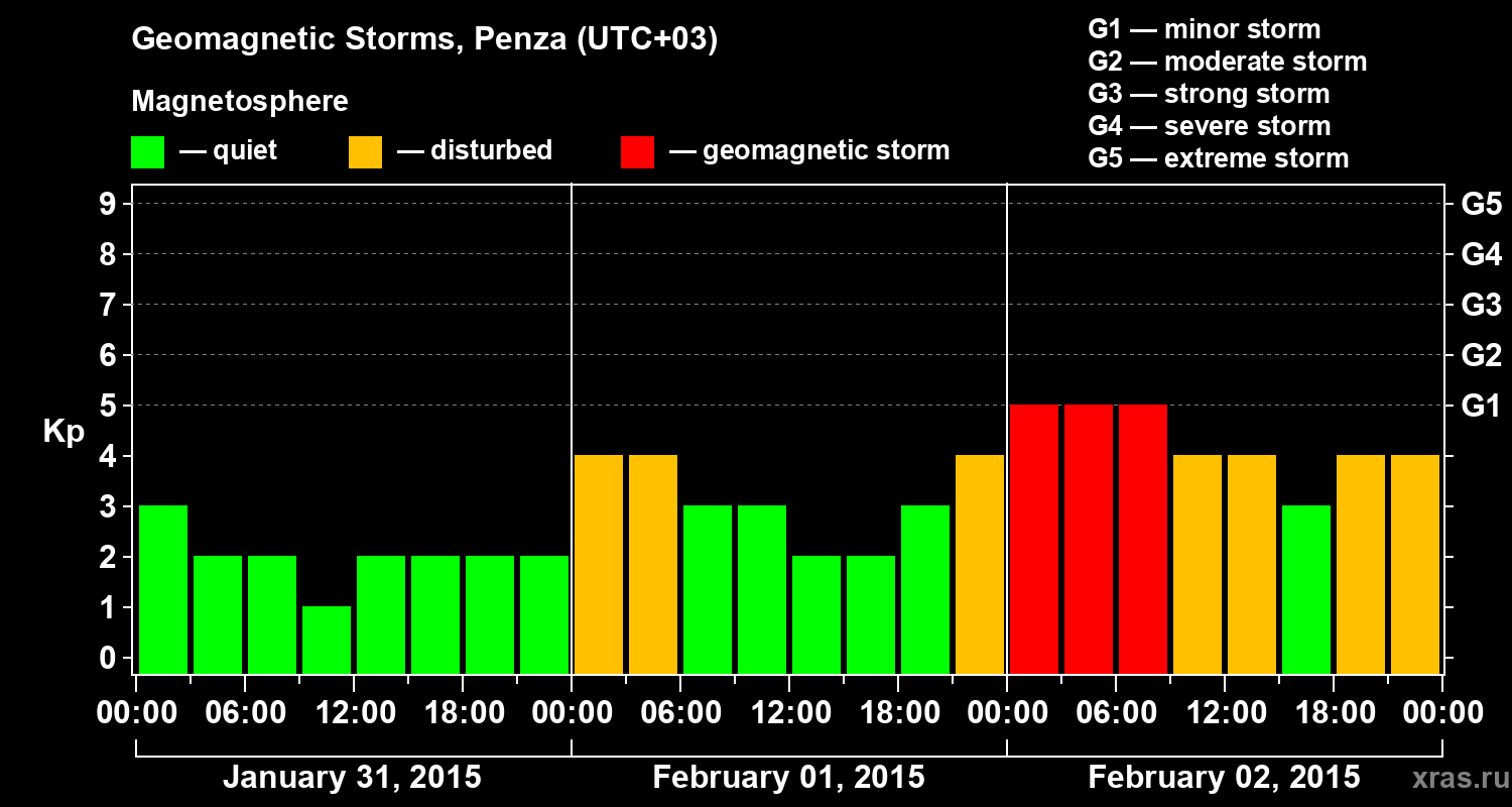 Changes in the geomagnetic index Kp from January 31 to February 2, 2015 for mid latitudes