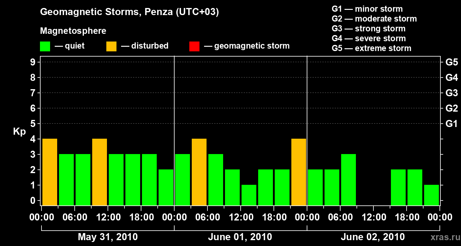 Changes in the geomagnetic index Kp from May 31 to June 2, 2010 for mid latitudes