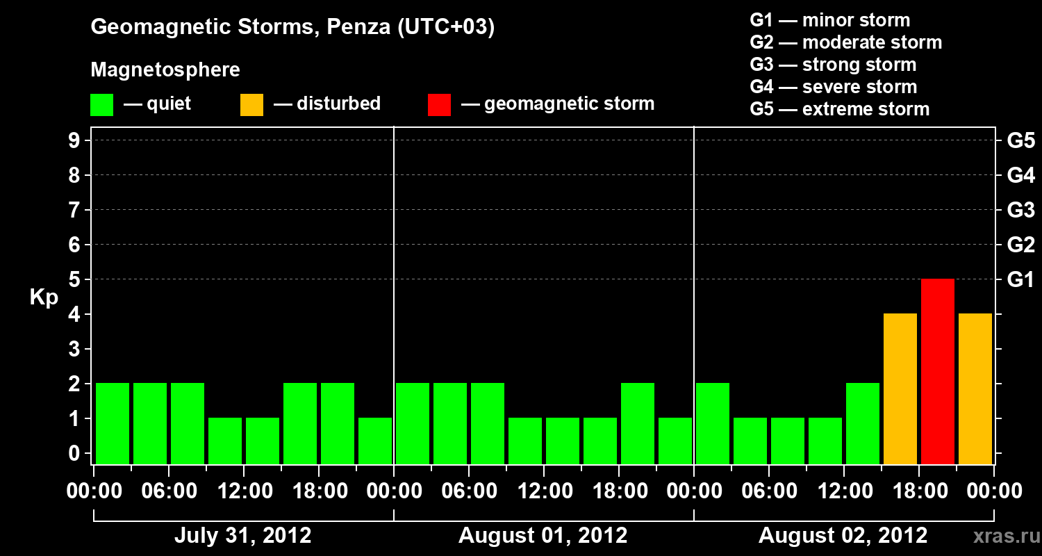 Changes in the geomagnetic index Kp from July 31 to August 2, 2012 for mid latitudes