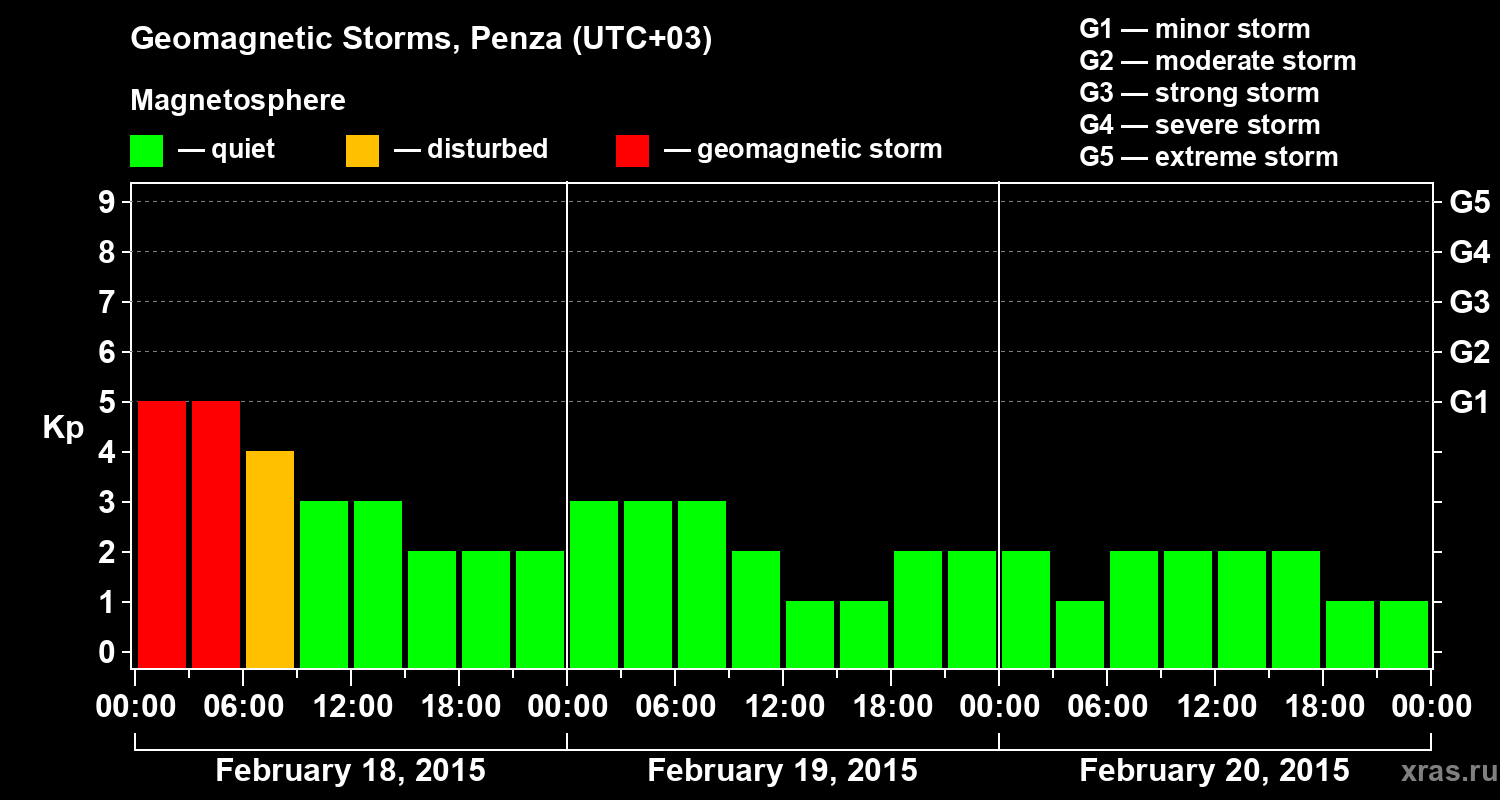 Changes in the geomagnetic index Kp from February 18 to 20, 2015 for mid latitudes