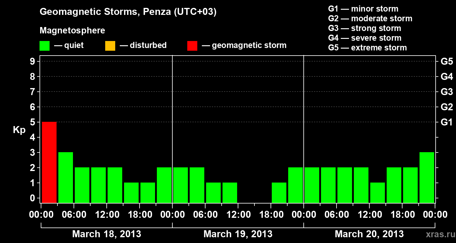 Changes in the geomagnetic index Kp from March 18 to 20, 2013 for mid latitudes