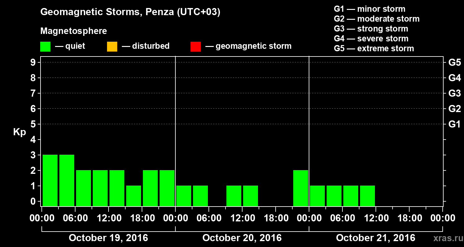 Changes in the geomagnetic index Kp from October 19 to 21, 2016 for mid latitudes