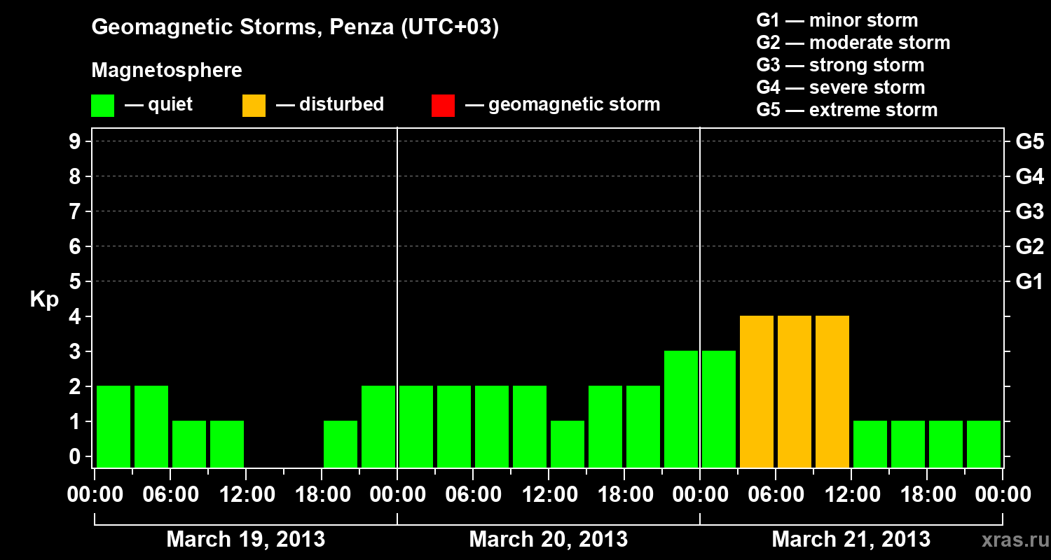 Changes in the geomagnetic index Kp from March 19 to 21, 2013 for mid latitudes