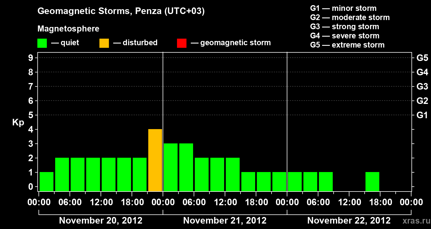 Changes in the geomagnetic index Kp from November 20 to 22, 2012 for mid latitudes