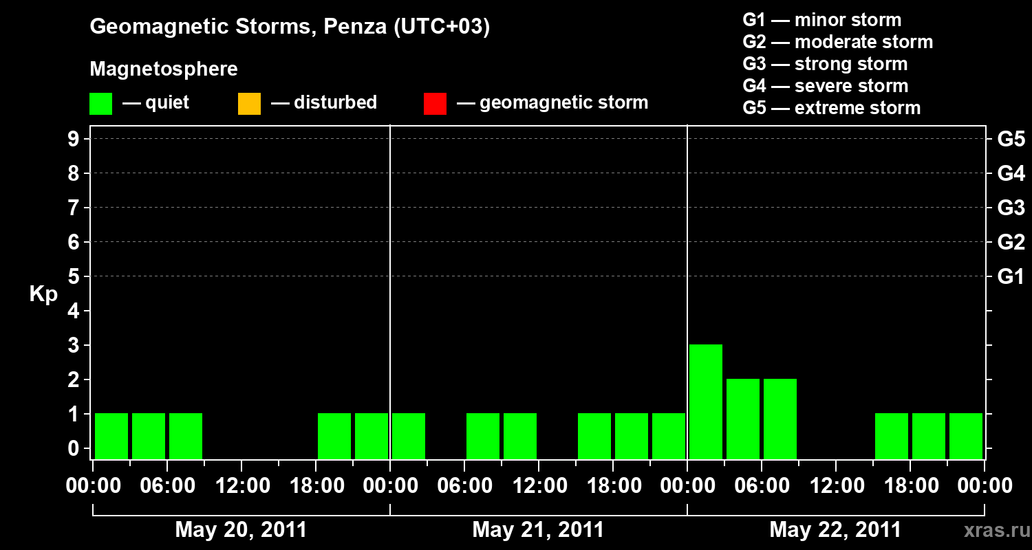Changes in the geomagnetic index Kp from May 20 to 22, 2011 for mid latitudes
