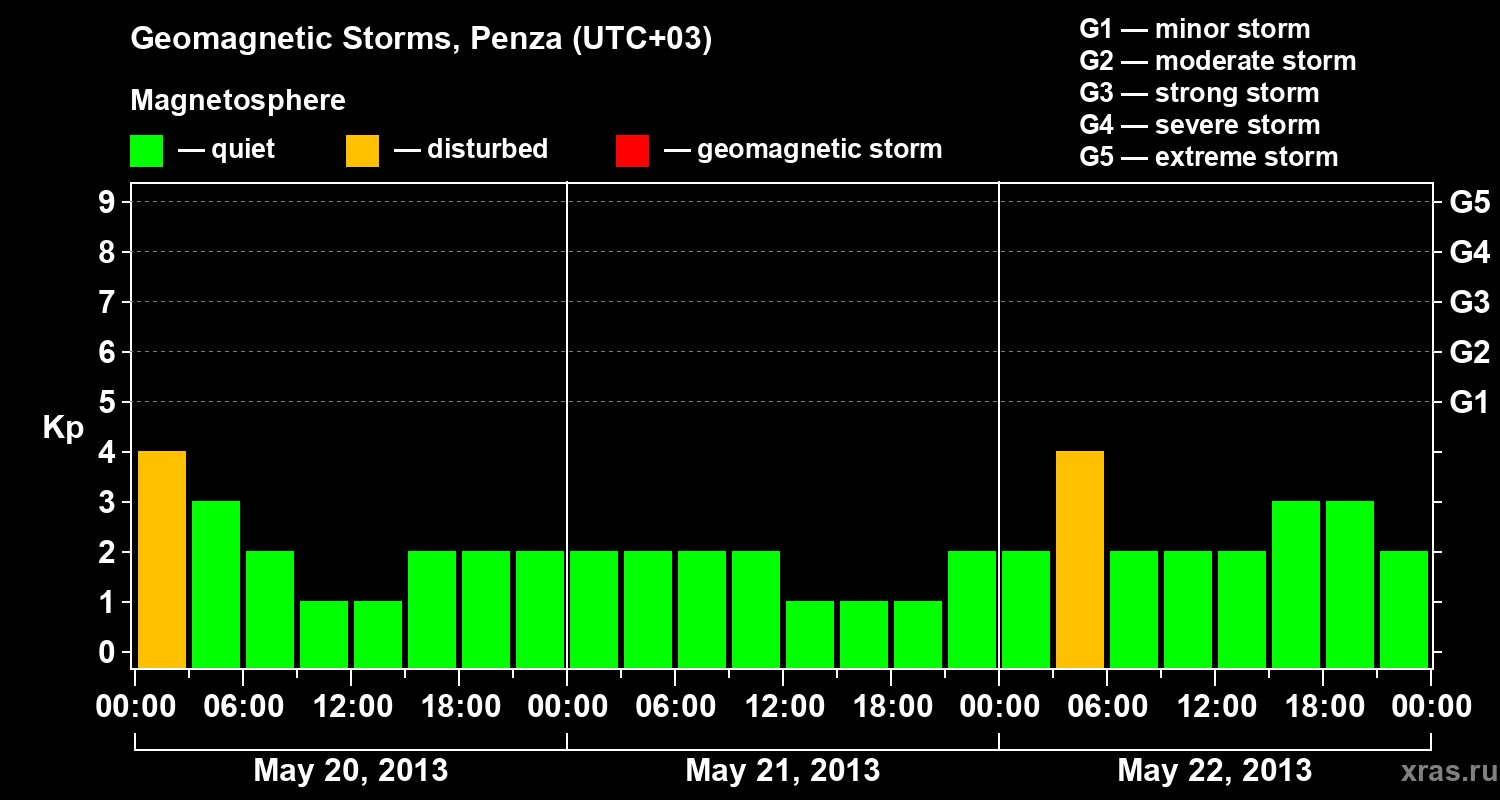 Changes in the geomagnetic index Kp from May 20 to 22, 2013 for mid latitudes