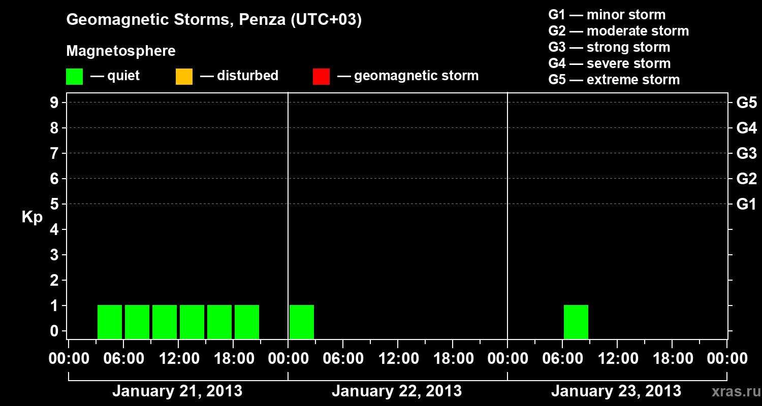 Changes in the geomagnetic index Kp from January 21 to 23, 2013 for mid latitudes