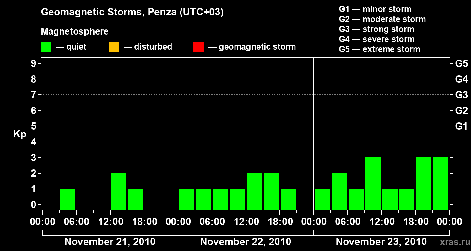 Changes in the geomagnetic index Kp from November 21 to 23, 2010 for mid latitudes