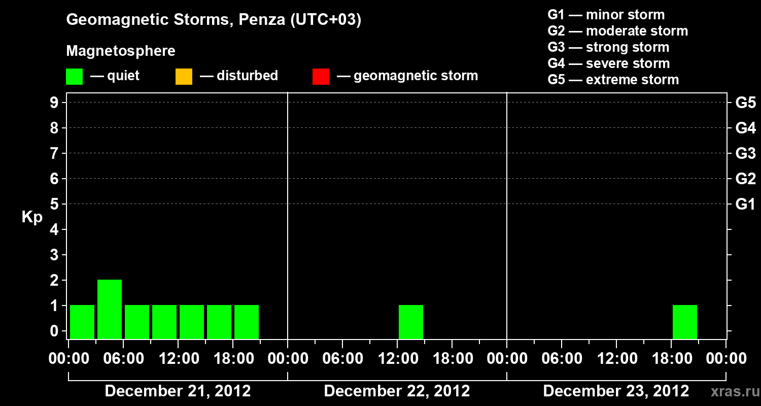 Changes in the geomagnetic index Kp from December 21 to 23, 2012 for mid latitudes