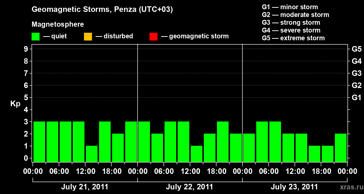 Changes in the geomagnetic index Kp from July 21 to 23, 2011 for mid latitudes