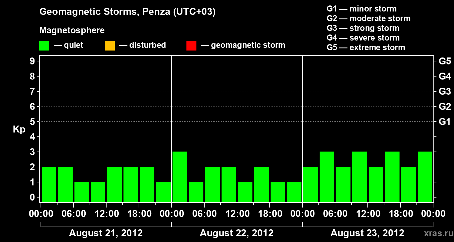 Changes in the geomagnetic index Kp from August 21 to 23, 2012 for mid latitudes