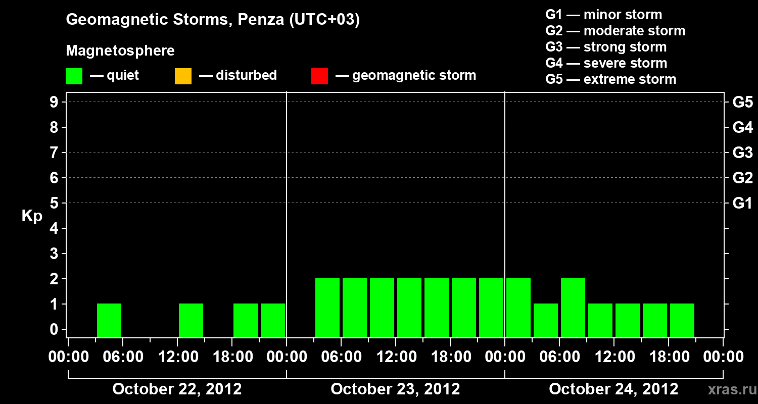 Changes in the geomagnetic index Kp from October 22 to 24, 2012 for mid latitudes
